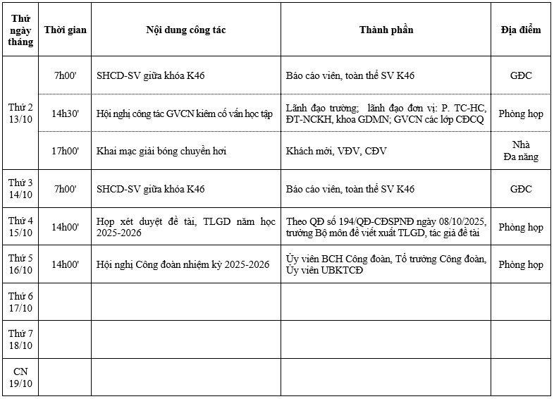 Tuần thứ 10 từ ngày 13/10/2025 đến ngày 19/10/2025