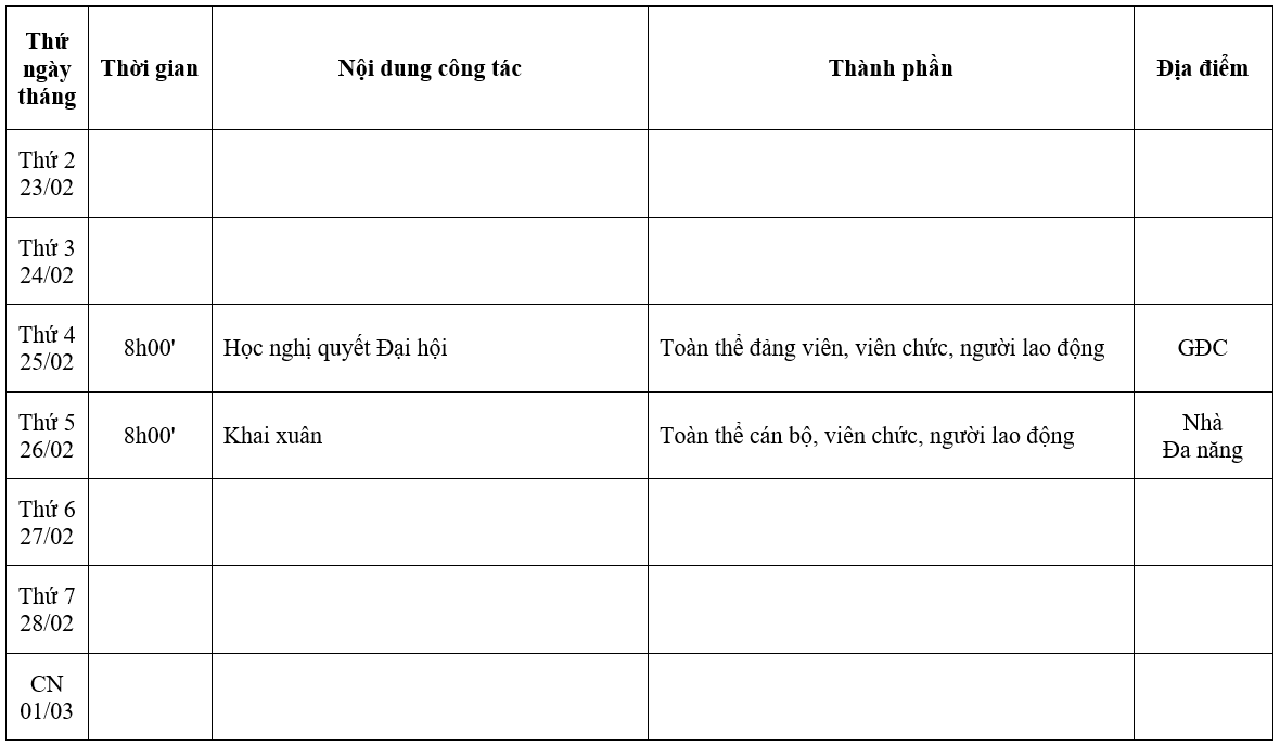 Tuần thứ 29 từ ngày 23/02/2026 đến ngày 01/3/2026Trang chủ»Lịch công tácadminThứ Ba 24/02/2026 - 9:58 Đánh giá Xem thêm: Tuần thứ 17 từ ngày 05/12/2022 đến ngày 11/12/2022 năm học 2022 – 2023 Thông báo lịch ôn và thi chứng chỉ tiếng anh A2(15/05/2018) Thông báo thi học kỳ V – K37 Cao đẳng chính quy(14/11/2017) Tuần thứ 11 từ ngày 23/10/2023 đến ngày 29/10/2023 Thông báo thi năng khiếu đợt 4(24/08/2021) Bài viết cùng chủ đề: Tuần thứ 27 từ ngày 09/02/2026 đến ngày 15/02/2026 Tuần thứ 26 từ ngày 02/02/2026 đến ngày 08/02/2026 Tuần thứ 25 từ ngày 26/01/2026 đến ngày 01/02/2026 Tuần thứ 24 từ ngày 19/01/2026 đến ngày 25/01/2026 Tuần thứ 23 từ ngày 12/01/2026 đến ngày 18/01/2026 Tuần thứ 22 từ ngày 05/01/2026 đến ngày 11/01/2026 Tuần thứ 21 từ ngày 29/12/2025 đến ngày 04/01/2026 Tuần thứ 20 từ ngày 22/12/2025 đến ngày 28/12/2025